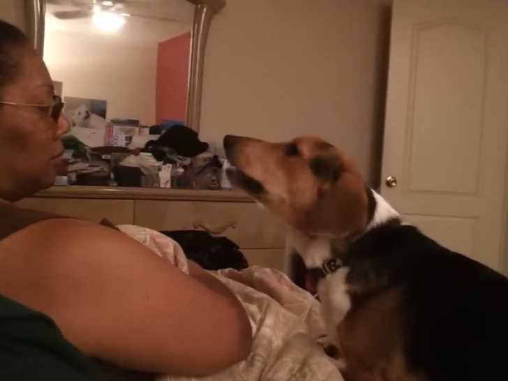 Ce Corgi Basset a grimpé sur le lit de ses propriétaires. Il se place à côté de sa maîtresse et tente d'attraper sa main sous la couette pour jouer. Il se met à aboyer bruyamment. Le Corgi Basset est issu du croisement entre le Basset Hound et le Welsh Corgi Pembroke.