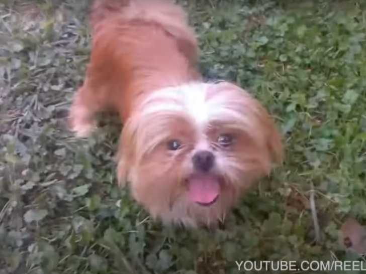 Ce petit chien est très heureux. Il joue et poursuit son maître partout dans l'arrière-cour. C'est agréable d'avoir des animaux aussi énergiques et enjoués autour de soi, ils rendent la vie plus amusante. Ce chien très joueur et sociable est un Jatzu, un mélange entre l'Épagneul Japonais (ou Chin) et le Shih Tzu.