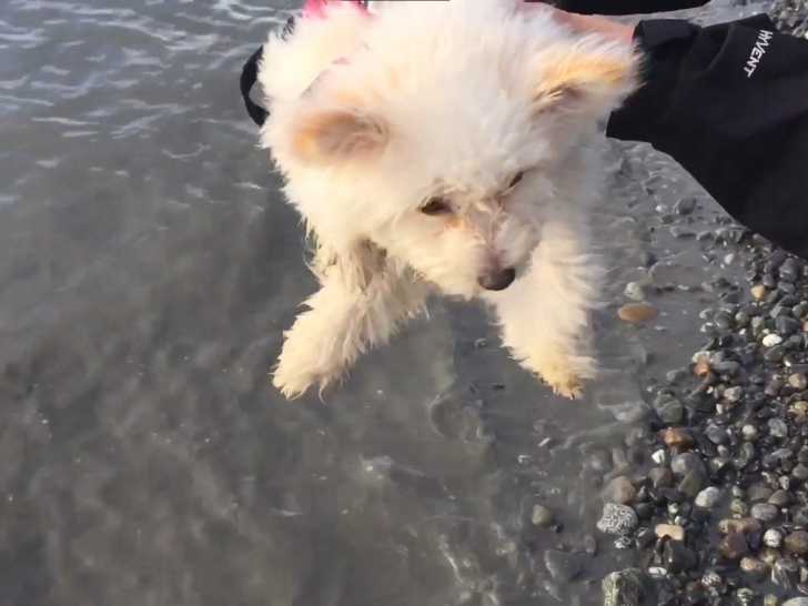 Ce Pomapoo a des comportements assez particuliers qui le rendent vraiment adorable. Il joue en poursuivant sa queue avec entrain et énergie. Sa réaction assez particulière lorsqu'il découvre la mer pour la première fois est tout aussi mignonne et fait craquer sa maîtresse qui l'a amené jusque-là. Le Pomapoo est issu du croisement entre un Loulou de Poméranie et un Caniche et est connu pour sa nature énergique et enjouée, ce qui se transmet parfaitement ici.