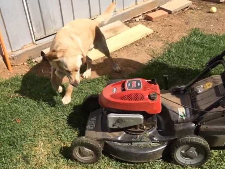 Ce Spanador, un croisement entre un Labrador Retriever et un Cocker Américain, profite d’un moment au soleil dans le jardin. Son maître décide de passer la tondeuse, ce qui ne plaît pas du tout à son compagnon à quatre pattes. Le chien se met alors à aboyer bruyamment contre la tondeuse, comme s'il voulait l'attaquer.