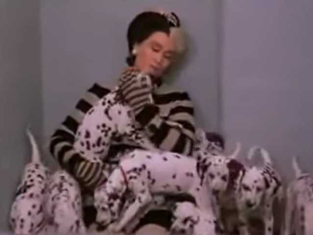 Le film Les 102 Dalmatiens sorti en 2001 et produit par les studios Disney raconte le retour de Cruella, une des méchantes les plus célèbres du cinéma, apparemment guérie de son obsession pour le motif blanc tacheté. Sortie de prison, Cruella tente de vivre normalement, mais rien à faire, son désir de se procurer à toute force des fourrures de Dalmatiens revient de plus belle.