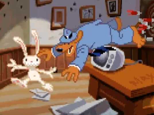 Sam & Max Hit the Road, sorti en 1993 par LucasArt, met en scène un chien en costume cravate au caractère plutôt posé : Sam, et un lapin, nu et psychotique : Max. Ces équipiers mal assortis sont confrontés à une enquête aussi énigmatique que retorse, accumulant actions et dialogues loufoques et hilarants.
