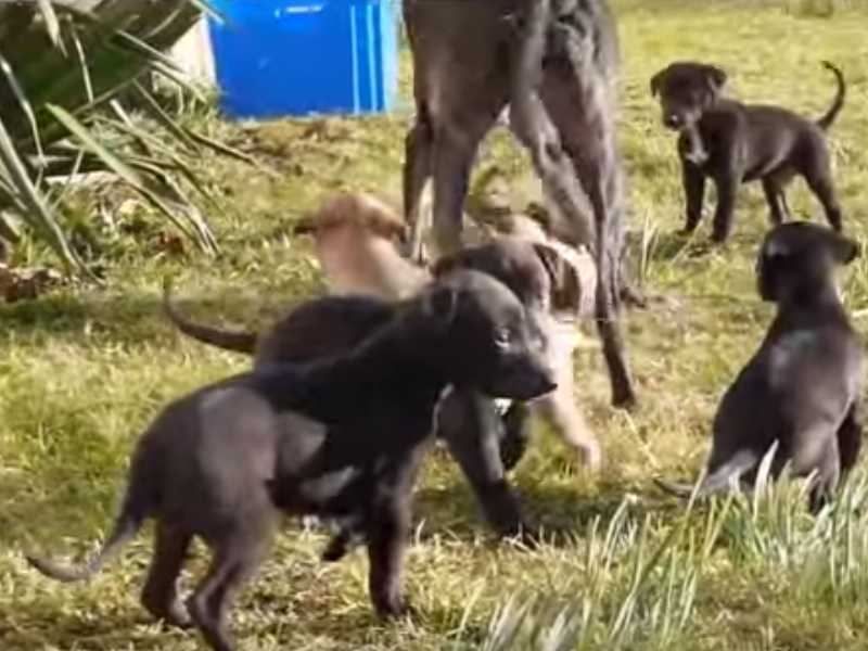Cette vidéo montre des chiots Whippet de 5 semaines avec leurs parents, qui jouent dehors. Ils n'osent pas trop s'éloigner de leur mère, mais ils essayent tout de même de découvrir ce qui passe dans leur environnement. Ils s'amusent et se chamaillent les uns avec les autres. Un bel exemple de complicité dans cette famille de chiens.