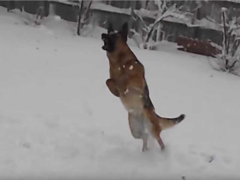 Ce Berger Allemand adore jouer dans la neige. Du coup, son maître en profite pour jouer avec lui et lui jeter de la neige !