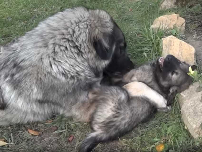 Un Berger Yougoslave accompagne ses chiots à la découverte de leur nouvel environnement. Âgés seulement de 7 semaines, ils ont déjà un gabarit massif. On les voit jouer entre eux, venir se chamailler, et être soignés par leur mère.