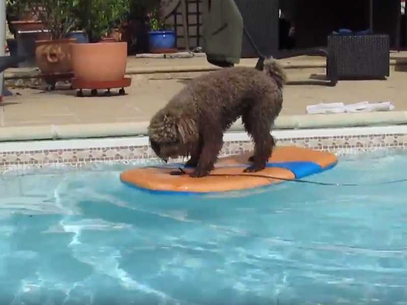 Le week-end Ferdinand, un Caniche, monte sur sa planche de surf. Il prépare scrupuleusement et minutieusement sa planche avant de surfer dessus. Et c'est parti pour du surf dans la piscine !