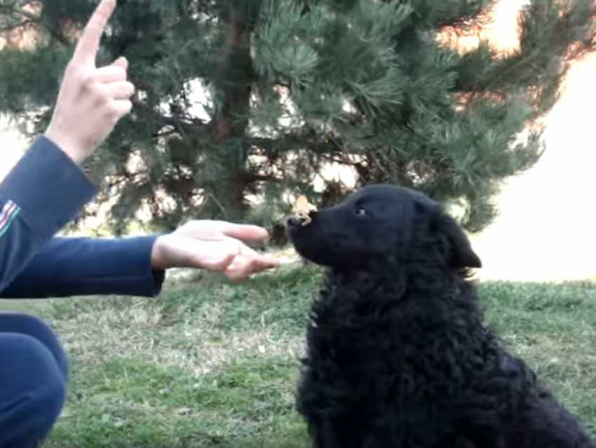 Plaçant de la nourriture dans la gueule de son chien, le maître demande à son compagnon d'attendre avant de le manger. Non satisfait de cet exercice, il vient récupérer la nourriture pour la placer sur le museau du Chien de Berger Croate, sans aucune réticence de ce dernier. Une fois l'ordre donné le chien ne se fait pas prier pour manger sa récompense méritée. Exercice d'obéissance parfaitement exécuté.