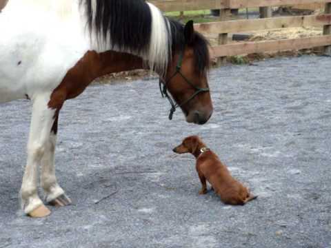 Ce chien voudrait bien s'amuser avec son copain. En raison de sa petite taille, il saute, se dresse sur ses pattes arrières, lui lèche les babines, les nasaux, remue la queue, lui montre par ses attitudes et ses mimiques son désir de partager un jeu. Si son compagnon reste paisible et se laisse faire, rien n'y fait, il ne paraît pas disposé à s'amuser avec ce petit trublion. Par moment le teckel semble même se décourager pour mieux recommencer et devant tant d’insistance, son partenaire préfère s'éloigner. Vidéo d'un chien joueur.