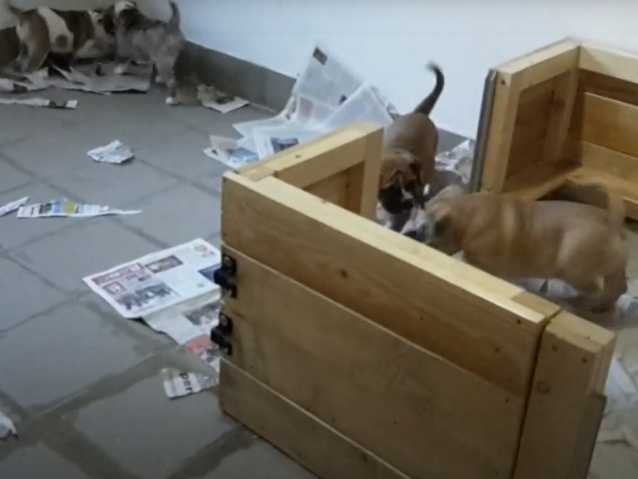 Des chiots Bulldog Continental s'amusent comme des petits fous avec des journaux étalés dans leur pièce de vie. Normalement utilisées pour apprendre la propreté aux chiots, les revues servent ici de jouets et sont joyeusement chiffonnées par les jeunes chiens. Ces derniers les éparpillent dans toute la pièce et les déchiquettent page par page.