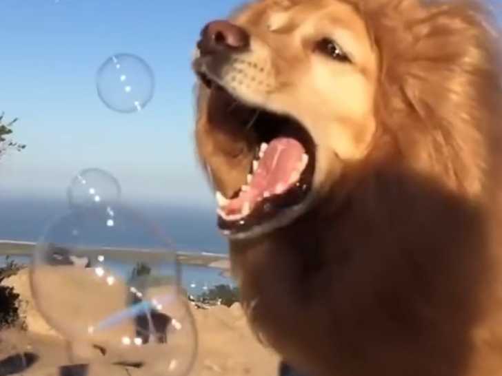 Beaucoup de gens sont fascinés par les lions, mais il est clair qu’en avoir un à la maison n’est pas envisageable. En revanche, rien n’interdit par exemple de toiletter ou déguiser son chien afin de le faire ressembler à ce redoutable prédateur, d’autant que ce changement d’apparence n’altère en rien son caractère. C’est le cas dans cette vidéo amusante d’un Golden Retriever vêtu d’une crinière de lion, qui conserve manifestement sa douceur légendaire et s’amuse d’ailleurs à courir joyeusement après des bulles.