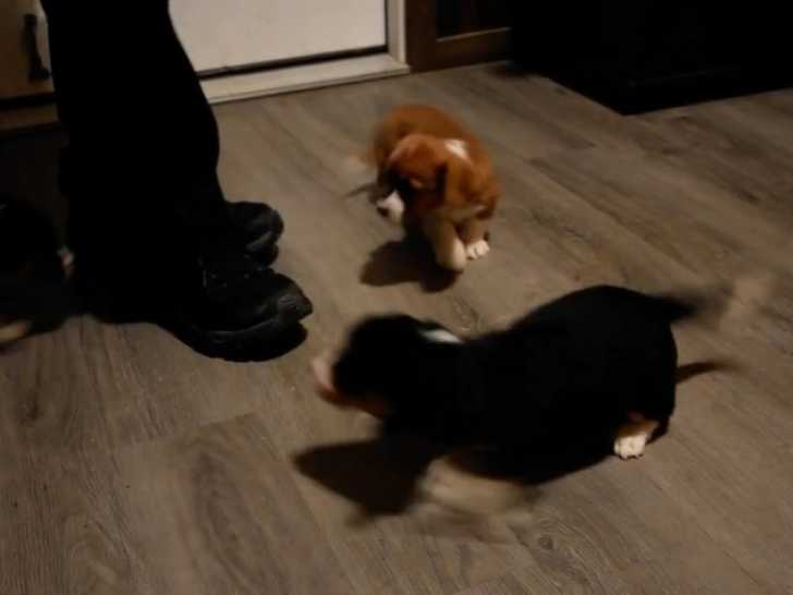 Ces chiots au pelage noir et marron, des Cava-Corgi, sont adorables et ne quittent pas leur propriétaire d'une semelle. Ils raffolent des moments d’attention et espèrent toujours recevoir des câlins. Le Cava-Corgi est issu du croisement entre le Cavalier King Charles Spaniel et le Welsh Corgi Pembroke.