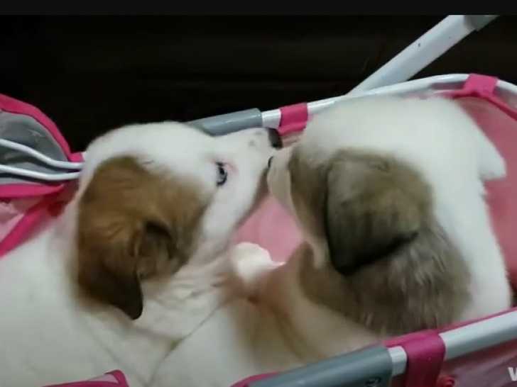 Ces deux Border Collies Pyrénées sont adorables et encore très jeunes. Leur propriétaire les a installés l'un à côté de l'autre dans une poussette rose. Ils se font des câlins et se lèchent le visage en signe d'affection. Le Border Collie Pyrénées est issu du croisement entre le Border Collie et le Chien de Montagne des Pyrénées.