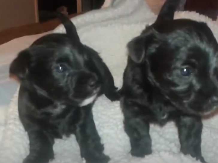 Ces deux jeunes Cairnoodles de quatre semaines sont confortablement installés sur une couverture dans le lit de leur maîtresse. Ils sont adorables et très calmes, profitant d'un moment de repos pour recevoir quelques caresses. Le Cairnoodle est issu d'un croisement entre le Cairn Terrier et le Caniche. C'est un compagnon attachant qui aime être diverti et passer du temps en famille.