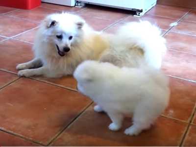 Voici une mère et son chiot; deux spitz japonais. Ensemble, ils jouent, partagent un petit moment complice et agréable. Ils ont l'air d'apprécier leur instant. Le petit semble s'amuser et embête sa maman qui a décidé de se laisser faire. Un joli petit moment entre une maman et son petit !
