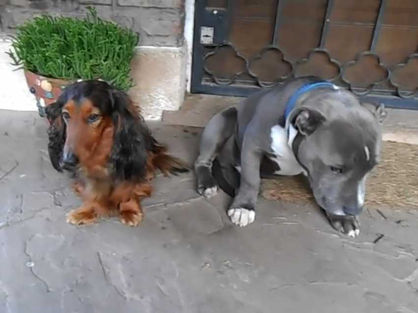 Ce pitbull et ce teckel ont véritablement fait quelque chose de mal. Pendant que leur maître leur fait la morale et demande qui est a mordillé sa semelle de chaussure, ces deux chiens ne savent plus où se mettre et semblent déjà regretter ce qu'ils ont fait. Le pitbull préfère se cacher derrière son acolyte pour ne pas avoir à assumer.