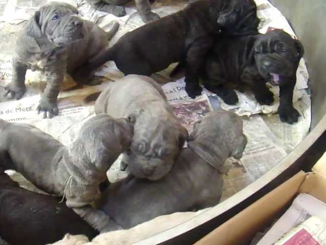 Voici une courte mais ô combien attachante vidéo d'un groupe de 13 Mâtins Napolitains âgés d'un mois. Il est toujours surprenant de les voir si petits et vulnérables quand on sait que dans moins d'un an tous seront devenus des molosses de 60 kilos en moyenne !