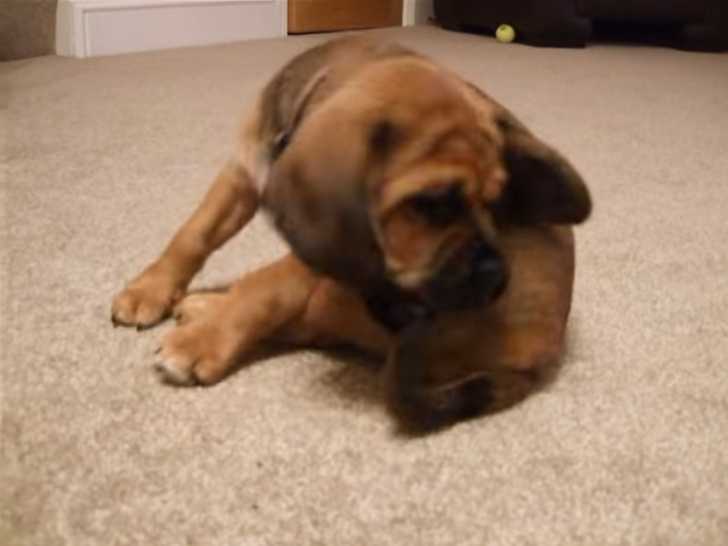 Harley est un jeune Cocker Pug (une race hybride aussi connue sous le nom de Pucker) âgé d’environ 10 semaines qui découvre son corps. Il joue avec sa queue et essaie de l’attraper avant d’aller chercher son panier pour s'amuser avec. Issu du croisement entre le Cocker Spaniel Anglais et le Carlin, le Pucker est une race de chien très joueur, sociable et affectueux.