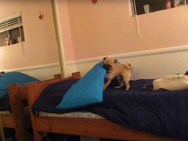 Voici un Puggle qui est fatigué et il souhaite dormir un peu. Seulement, le lit sur lequel il a décidé de faire sa sieste n’est pas à sa convenance. Il va alors tirer les coussins avec sa mâchoire, et ainsi libérer la place pour pouvoir se mettre au chaud sous les couvertures. Quel petit chien talentueux !
