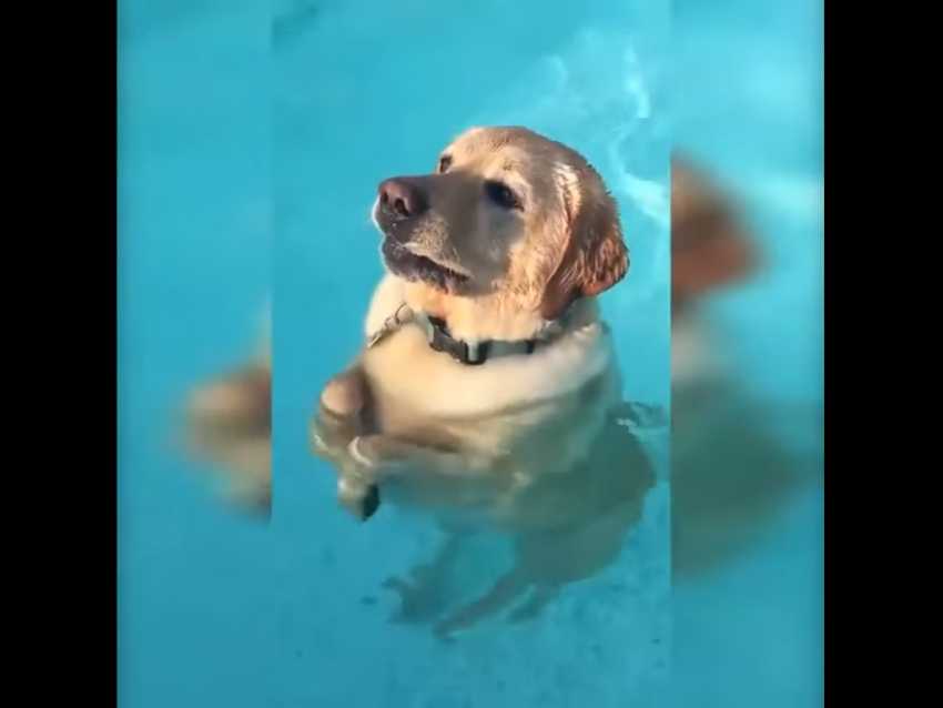 Cette séquence montre un chien Labrador en train de nager tranquillement dans une piscine, lorsqu'il se rend compte soudainement qu'il a pied. Il s'arrête de nager et reste immobile. C'est alors le fou rire pour ses maîtres face à sa réaction amusante. Il semble surpris et se tient droit, ses pattes de devant relevées.