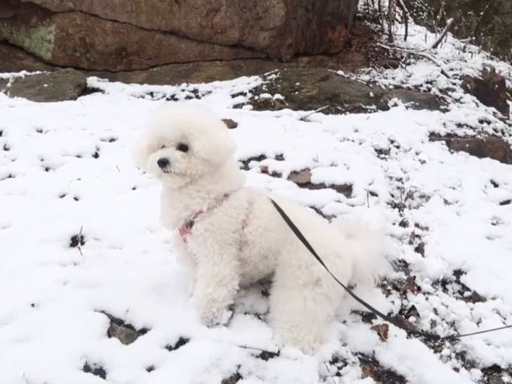 Cette vidéo montre un chien Bichon Frisé, Bom, qui réagit en voyant la neige pour la toute première fois. Il ne semble pas du tout surpris de marcher sur cette couche blanche immaculée : on le voit se promener comme à son habitude. Bom ne semble pas non plus craindre le froid.