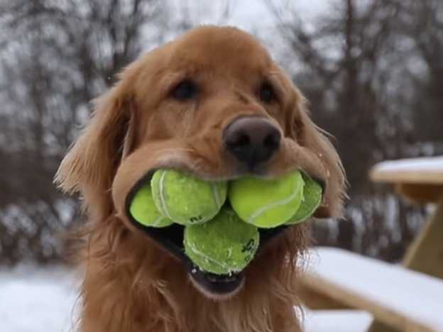 À New York, Finley, un Golden Retriever de 6 ans, s'est montré capable de tenir six balles de tennis en même temps dans sa gueule. Cela ne semble pas vraiment difficile pour lui qui se balade avec sans les faire tomber, ou presque, et il peut même les ramasser toutes ensemble sans aucune aide.