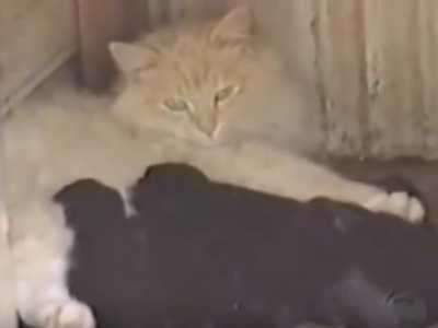 Après avoir accouché de chatons morts-nés, cette magnifique chatte à poils longs a recueilli les petits de la chienne de la famille. Elle va ainsi élever 7 chiots, les allaitant et les éduquant comme si elle était leur propre mère... On peut tout de même se demander comment vont se comporter ces chiots à l'âge adulte !