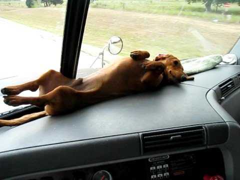 Ce chien dort sur le dos, allongé de tout son long, sur son l'emplacement favori qui est le tableau de bord du camion de ses maîtres. Le véhicule qui roule le berce et le plonge dans un profond sommeil car, après avoir ouvert un œil aux appels de sa maîtresse, il se rendort. Vidéo d'un Teckel drôle qui s'appelle Henry