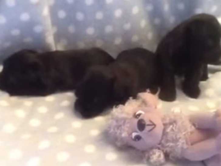 Ces trois femelles Carnauzer, au pelage noir brillant, sont absolument adorables. Leur propriétaire les a installées au cœur d’une couette douillette, à côté d’une peluche qui semble déjà devenir leur compagnon préféré. Encore très jeunes, elles sont calmes, paisibles et bougent à peine, profitant de ce cocon de confort.