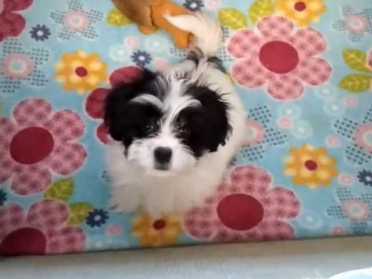 Benji est un adorable petit Papastzu au pelage noir et blanc. Il est confortablement installé dans un landau sur plusieurs couvertures, afin que ses maîtres puissent le surveiller de près. Il attend patiemment le moment où il pourra sortir et jouer. Benji est issu du croisement entre un Shih Tzu et un Épagneul Nain Continental Papillon