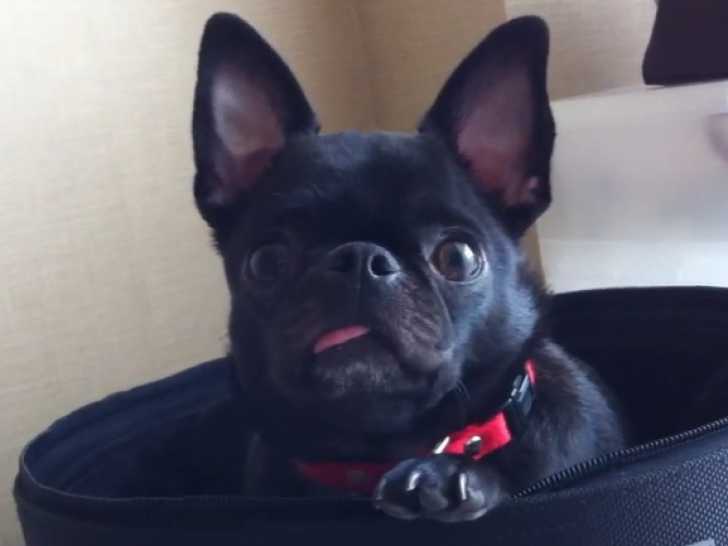 Ce Chug est vraiment adorable. Installé confortablement dans son panier, il reste très calme et immobile, observant son environnement avec curiosité. Avec sa langue légèrement sortie, il donne l'impression amusante de nous tirer la langue. Issu du croisement entre le Carlin et le Chihuahua, ce Chug est un compagnon attendrissant et loyal.