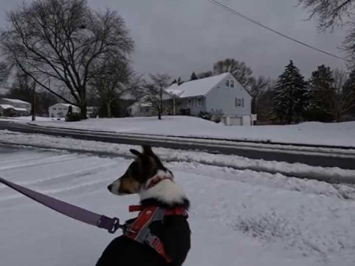 Ce Cosheltie est parti en promenade en laisse avec son maître. Il vient de neiger, et le sol est désormais recouvert d'une belle couche blanche. Ce compagnon, tout excité, s'amuse à sauter et se rouler sur le sol. Le Cosheltie est issu du croisement entre le Berger des Shetland et le Border Collie.