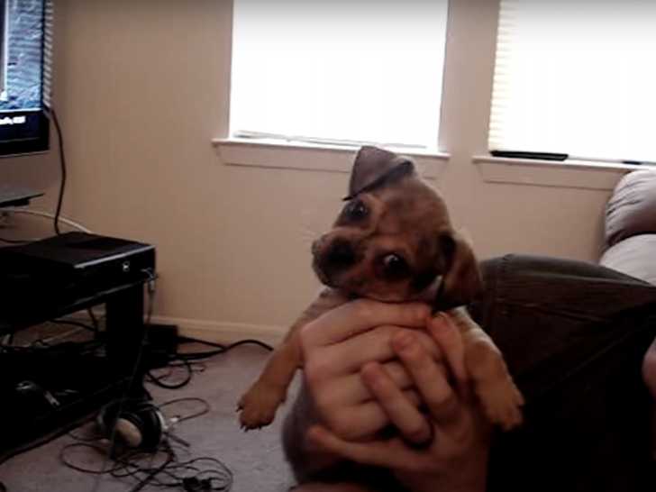 Ce charmant Daug tourne de manière adorable la tête lorsqu'il perçoit des petits grincements, manifestant son intérêt depuis les bras de son maître. Le Daug est issu du croisement entre le Carlin et le Teckel. Bien qu'affectueux, il laisse parfois transparaître son instinct de chasseur notamment en réagissant à des bruits inhabituels.
