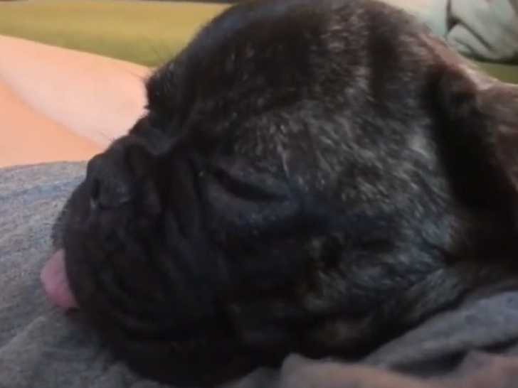 Ce petit Frug au pelage noir, un chien hybride issu du croisement entre un Bouledogue Français et un Carlin, s'est endormi sur son maître en tirant la langue. Ce qui le rend encore plus mignon, c'est qu'il émet des petits bruits laissant penser qu'il fait un rêve très intense. Ses petits ronflements apaisants confirment qu'il dort paisiblement. Les Frugs sont des chiens affectueux qui ne nécessitent pas beaucoup d'exercice, et celui-ci semble particulièrement apprécier prendre du repos.