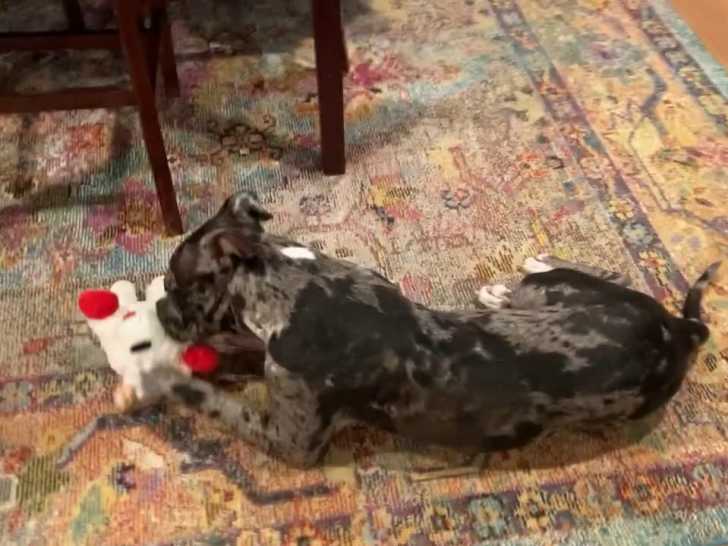 Zoomie, un jeune Pitahoula, s'amuse avec une peluche, la secouant et la mordillant avec énergie. Ce croisement entre le Chien Léopard Catahoula et le Pitbull combine force et dynamisme, des traits que Zoomie exprime pleinement dans son jeu. Zoomie est un chien de sauvetage qui vient tout juste d’être adopté par son nouveau maître.