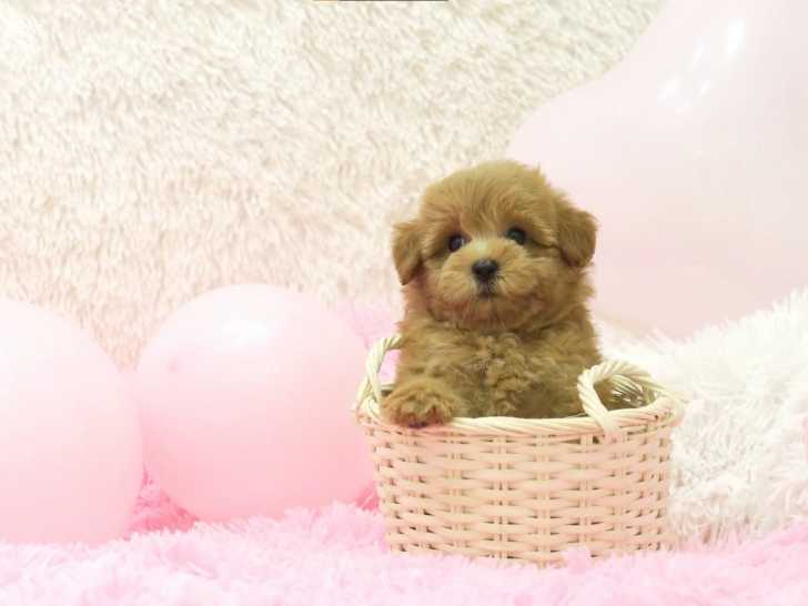 Cet adorable chiot est un Pomapoo, une race issue du croisement entre le Loulou de Poméranie et le Caniche et qui est connue pour son caractère enjoué et joueur. Ce chien semble poser au milieu d’un environnement aux couleurs claires dans un petit panier comme un mannequin. Sa fourrure douce et ondulée en fait le candidat parfait pour ce rôle.