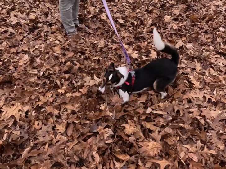 Cette Cosheltie, du nom de Riley, est sortie se balader dans un parc en automne. Les arbres ont perdu leurs feuilles, qui couvrent désormais le sol. Riley s'amuse énormément et a envie de courir dans tous les sens, mais elle est tenue en laisse par sa maîtresse. Le Cosheltie est issu du croisement entre le Berger des Shetland et le Border Collie.