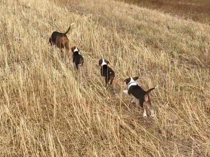 Cette vidéo montre une maman Brachet Allemand accompagnée de ses chiots d'un mois et demi lors d'une sortie dans un champ. Ils semblent prendre plaisir à découvrir cet environnement et s'intéressent tout particulièrement à un tas de pierre, y reniflant apparemment l'odeur d'une truie. Cela n'a guère de surprenant, dans la mesure où cette race est réputée pour ses talents à la chasse.