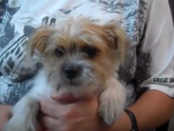 La maîtresse de Lucy la tient dans ses bras, où elle semble parfaitement à l'aise et épanouie. Sa propriétaire lui fait même quelques caresses. Lucy, une Ratshi Terrier au pelage clair, est issue du croisement entre un Rat Terrier et un Shih Tzu. C'est un compagnon fidèle et affectueux, idéal pour les familles.