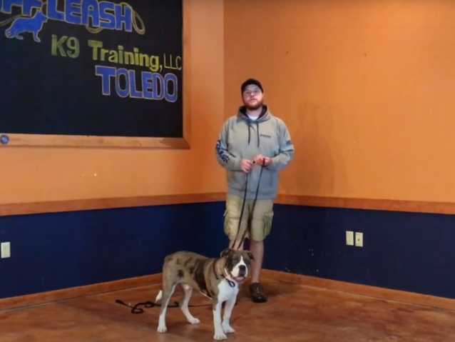 C’est tout d’abord dans une salle réservée aux entraînements qu'un Alapaha Blue Blood Bulldog se familiarise avec le port de la laisse. Puis, c’est en extérieur que ce chien va faire ses premières balades en laisse en compagnie de l’éducateur canin en charge de ce cours. Au final, l'exercice est réalisé avec succès.