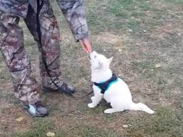Séance de dressage pour ce petit chiot Hokkaido Ken. Il apprend à marcher au pas à côté de son maître, qui le récompense d’une friandise à chaque arrêt. Son objectif est de lui faire bien comprendre l'ordre donné.Une technique simple à reproduire chez soi avec son animal, pour de futures bonnes promenades.