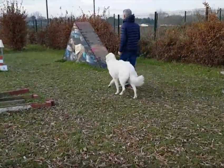 L'obéissance d'un chien vis à vis de son maître s'accroît jour après jour si celui-ci est soumis régulièrement à des exercices. L'un d'entre eux est la marche au pied, exercice fondamental pour travailler la relation hiérarchique entre un chien et son maître mais aussi très important lors de futures balades en extérieur. Ce jeune Berger Polonais de Podhale apprend, à l'aide d'une laisse, à marcher au pied, au rythme de son maître.