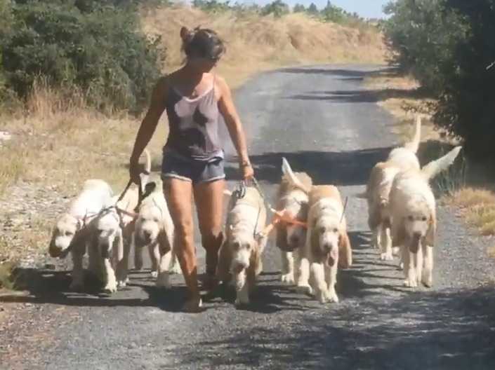 L’apprentissage de la marche en laisse est une étape importante dans l’éducation d'un chiot et doit être enseignée dès le plus jeune âge. Ici les Grands Griffons Vendéens ont 6 mois. Certains sont en laisse car pas suffisamment entraînés à marcher au pas, contrairement à ceux un peu plus à l'arrière qui ont acquis ce réflexe.