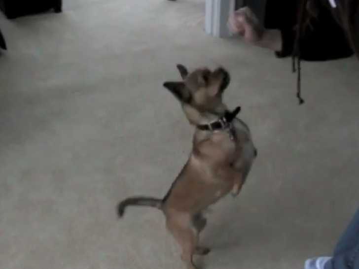 Ce French Bullhuahua, âgé de trois ans, maîtrise de nombreux tours, tels que s'asseoir, se rouler et se mettre debout. Il est très obéissant et reçoit des friandises en récompense chaque fois qu'il réussit un ordre de son maître. Le French Bullhuahua est le fruit du croisement entre le Bouledogue Français et le Chihuahua.