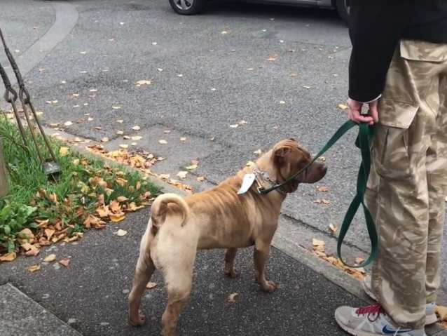 Voici un Mini Peï qui va apprendre à marcher en laisse dans un environnement urbain. Il doit se promener tranquillement et cela sans tirer en avançant.