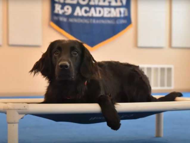 Après une séance d'échauffement sur un tapis roulant, un Retriever à Poil Plat part faire une balade en laisse avec son éducateur canin. Puis vient l’heure des exercices en salle.