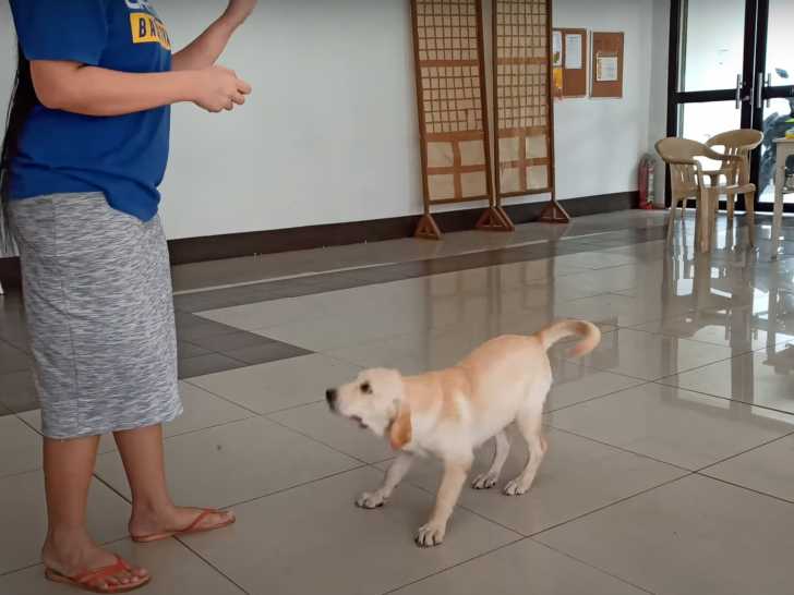 Ce chien Goldador de quatre mois apprend des tours avec sa maîtresse. Par exemple, il apprend à donner la patte quand cette dernière lui tend la main. En récompense, elle lui donne une petite friandise quand il obéit bien. Issu du croisement entre le Golden Retriever et le Labrador Retriever, le Goldador est un chien tolérant et sensible.