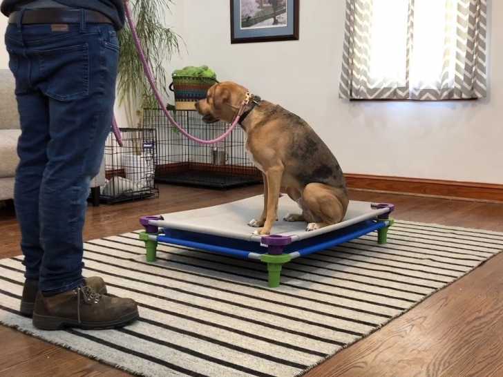 Ce chien Labahoula apprend à rester dans un espace qui lui est dédié. En effet, dans ce salon, il y a un panier où ce chien Labahoula, issu du croisement entre le Chien Léopard Catahoula et le Labrador Retriever, doit aller s'asseoir ou se coucher sans en sortir tant que l'on ne lui a pas donné l'ordre.