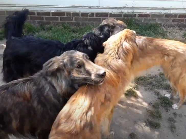 Ces quatre Gollies célèbrent leur premier anniversaire en courant et jouant dans un grand jardin. Bien qu'ils aient des pelages de couleurs différentes, ils viennent tous de la même portée. Le Gollie est issu du croisement entre le Golden Retriever et le Colley à Poil Court ou Long, c'est un compagnon loyal et attachant.