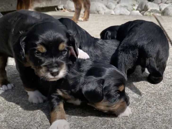 Timmie, Beauferd, Penelope et Socks sont quatre petits Aussaliers, une race hybride issue du croisement entre le Cavalier King Charles Spaniel et le Berger Australien. Dans cette vidéo, ils découvrent leurs sens et leur environnement pour la première fois. En effet, ils semblent timides et hésitants lorsqu'ils marchent à côté les uns des autres en se faisant des câlins.