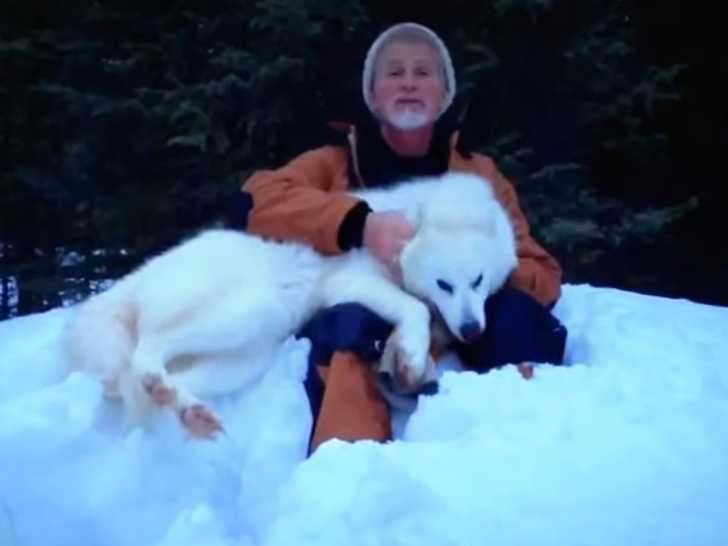Un homme tente de présenter son Esquimau Canadien. Assis dans la neige, il tient tant bien que mal son chien sur les genoux. Cependant, celui-ci n'a manifestement pas envie de rester calme et veut jouer avec son maître.